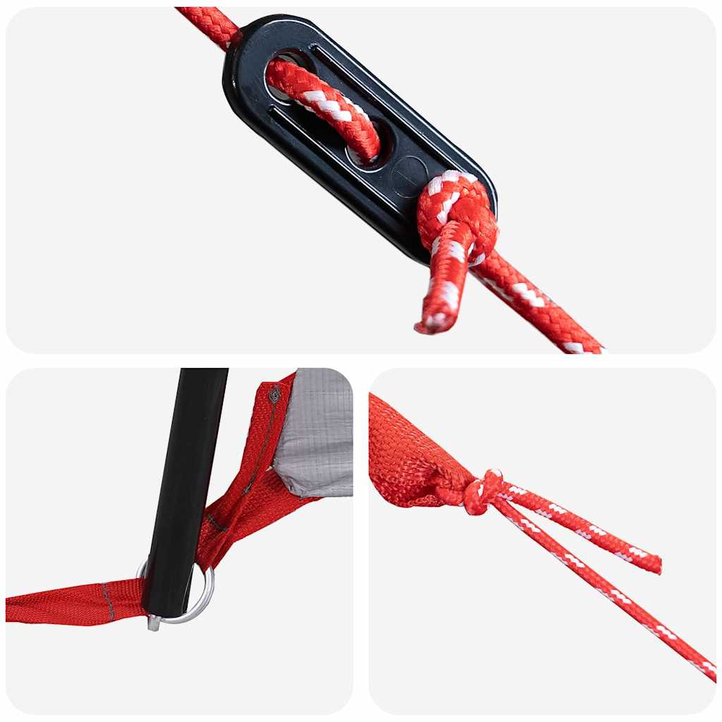 - Įtraukti komponentai: Šioje palapinėje yra stogas, polių komplektas, lynai ir žemės kaiščiai, todėl ji pritaikyta išgyventi bet kokius orus. Taip pat pridedamas nešiojimo krepšys, kad ją lengvai galėtumėte pasiimti su savimi, kur bebūtumėte.