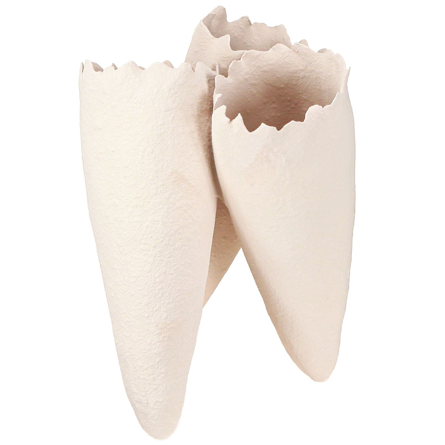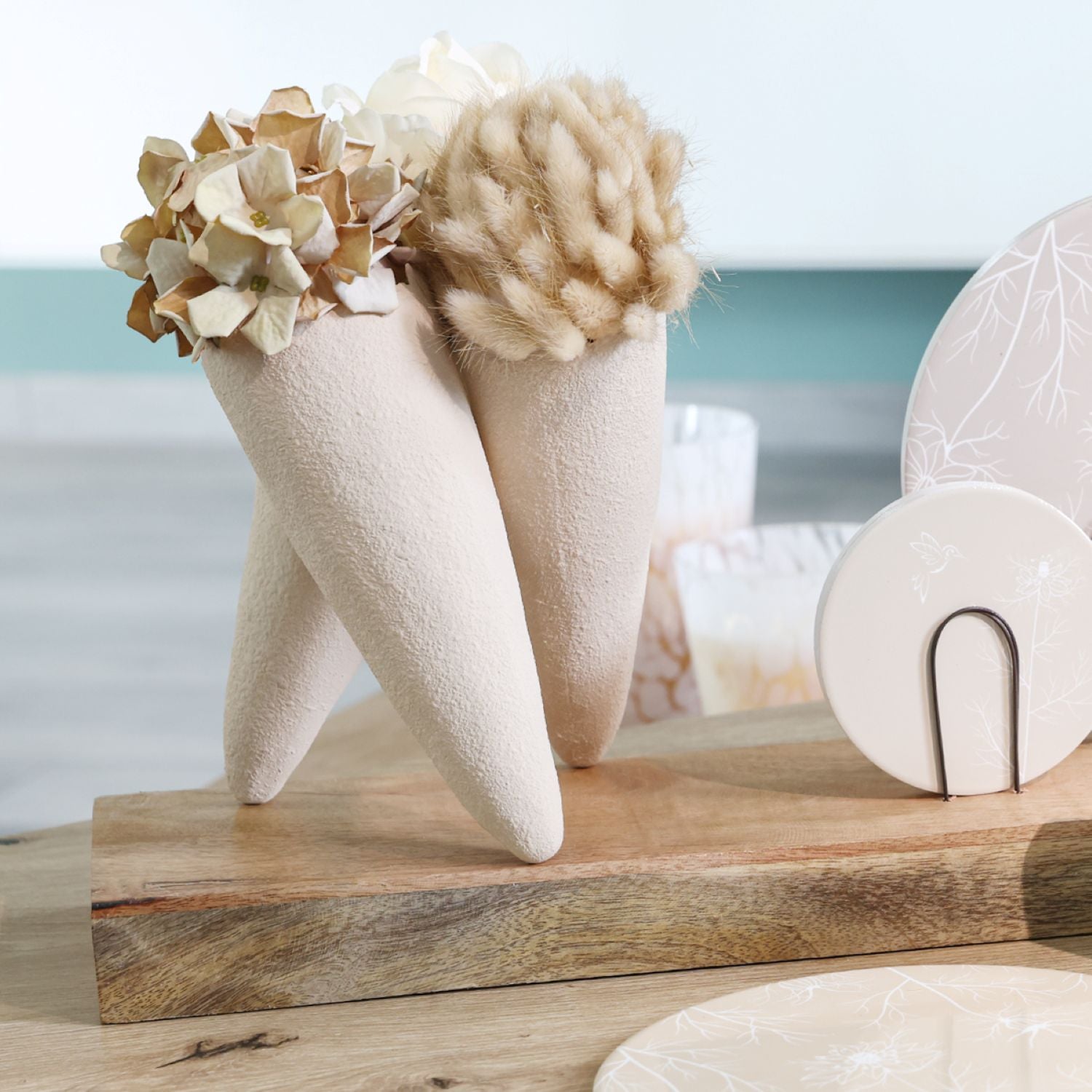Moderni vaza iš trijų tarpusavyje sujungtų kūgio formos dalių – išskirtinis akcentas jūsų interjerui. Šviesiai smėlio spalvos keramika spinduliuoja natūralumu, o neįprasta forma suteikia šiai dekoracijai unikalumo. Puikiai tinka džiovintoms gėlėms ar sausoms kompozicijoms.
