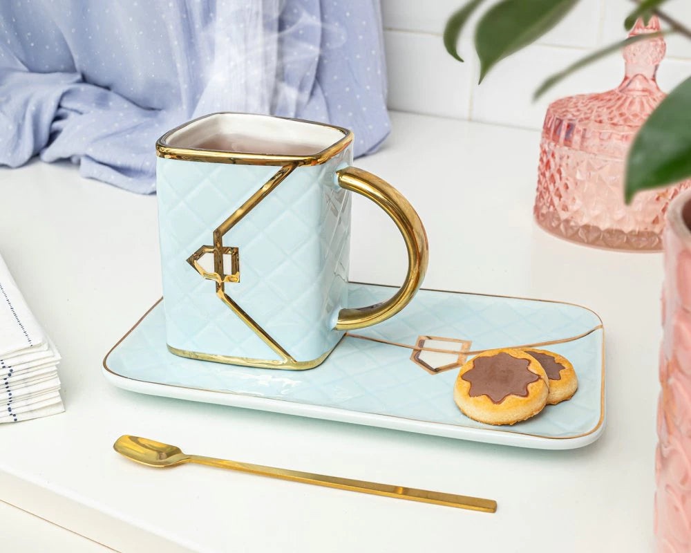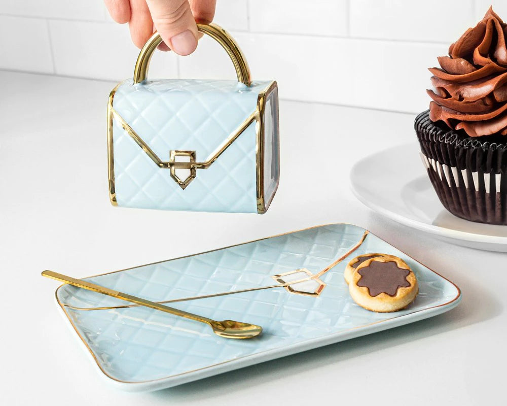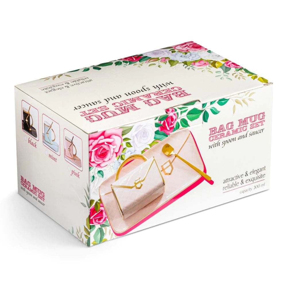 Ieškote originalios dovanos ypatingai moteriai? Šis elegantiškas rinkinys su puodeliu, stovu ir auksiniu šaukšteliu yra puiki idėja! Rinkinyje net du elementai – stilingas puodelis ir moteriško stiliaus stovas, primenantis delninę rankinę, bei elegantiškas auksinis šaukštelis, kuris suteikia spindesio kiekvienai arbatai ar kavai.