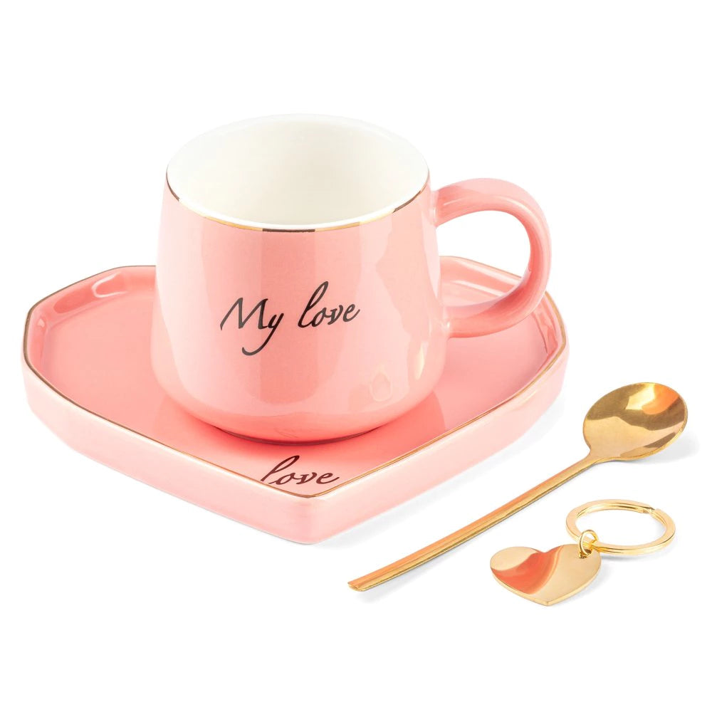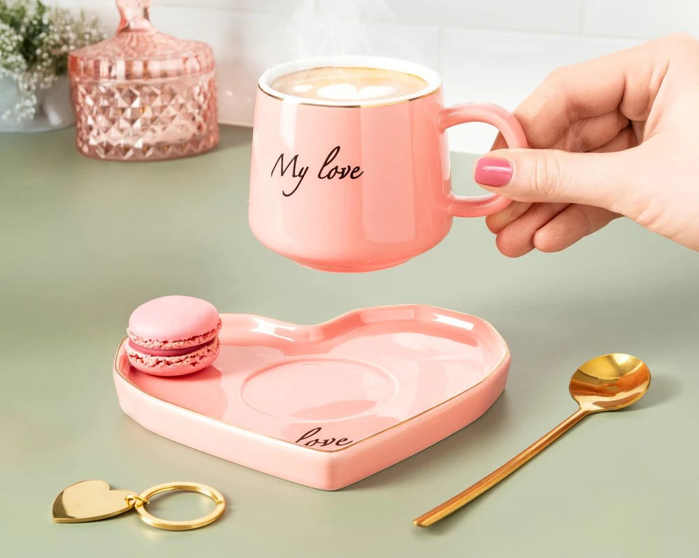 Keraminis puodelis – romantiško rožinio atspalvio su baltu vidumi, papuoštas auksiniu apvadu ir subtiliu užrašu „Mano meilė“. Puodelio forma puikiai priglunda prie rankų, todėl kiekviena akimirka su mėgstamu gėrimu tampa ypatinga.