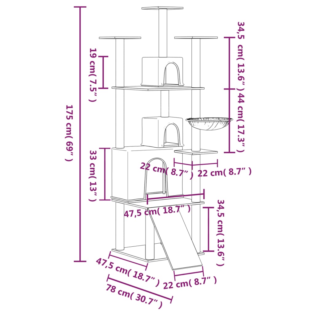 - Viskas viename bokštas katėms: kelių aukštų baldas katėms turi 3 namelius, 1 hamaką, 1 kopėčias ir platformas, tad jūsų katės turės puikią vietą laipioti, tupėti, draskyti, slėptis bei pailsėti.