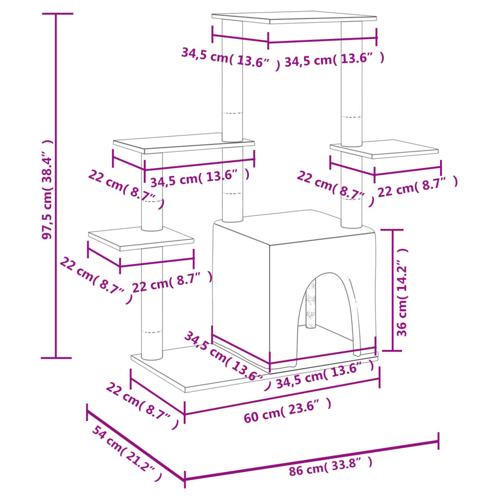 - Viskas viename bokštas katėms: kelių aukštų baldas katėms turi namelį ir platformas, tad jūsų katės turės puikią vietą laipioti, tupėti, draskyti, slėptis bei pailsėti.