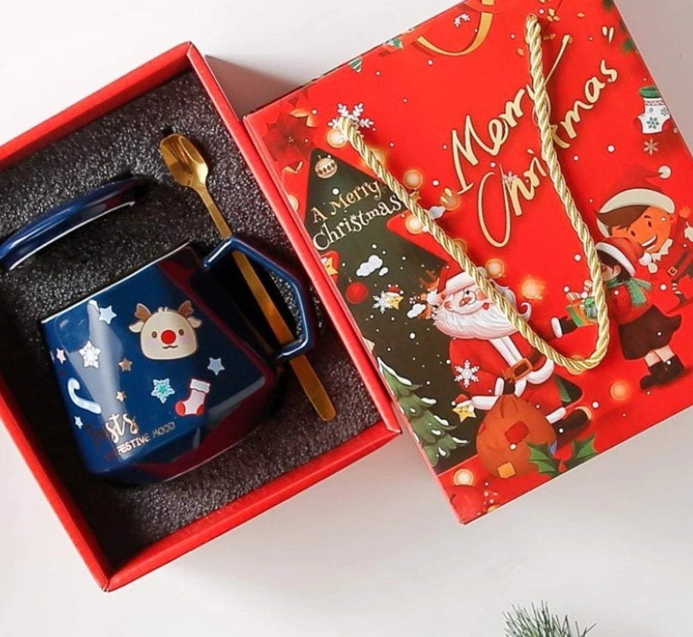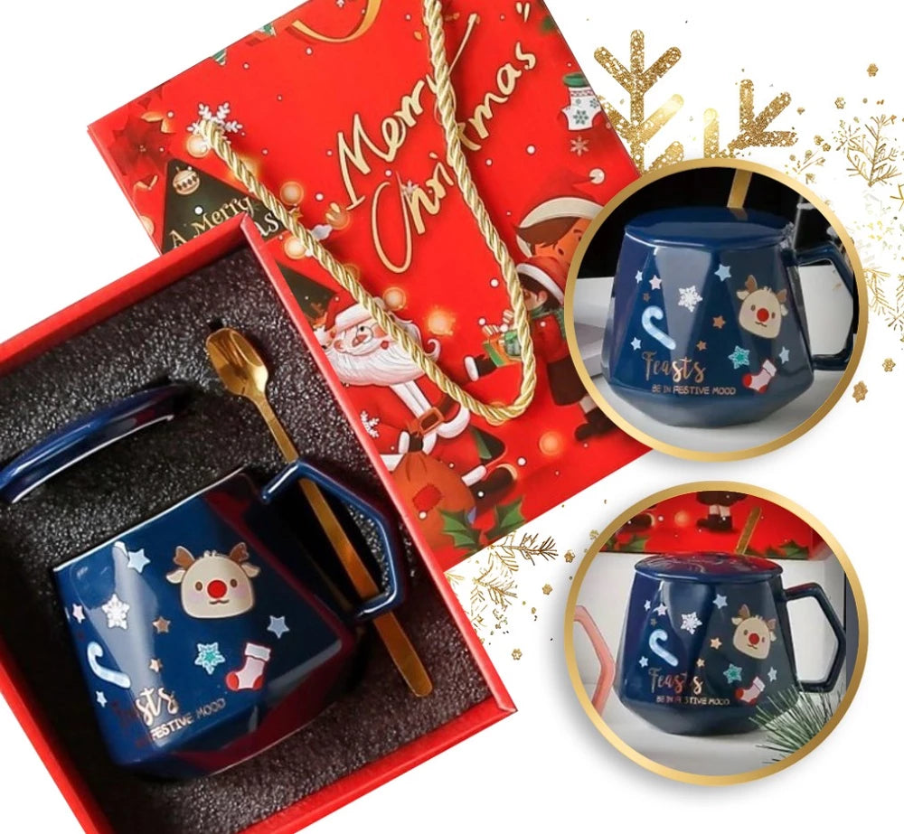 Kalėdinis puodelis su dangteliu ir šaukšteliu dėžutėje
