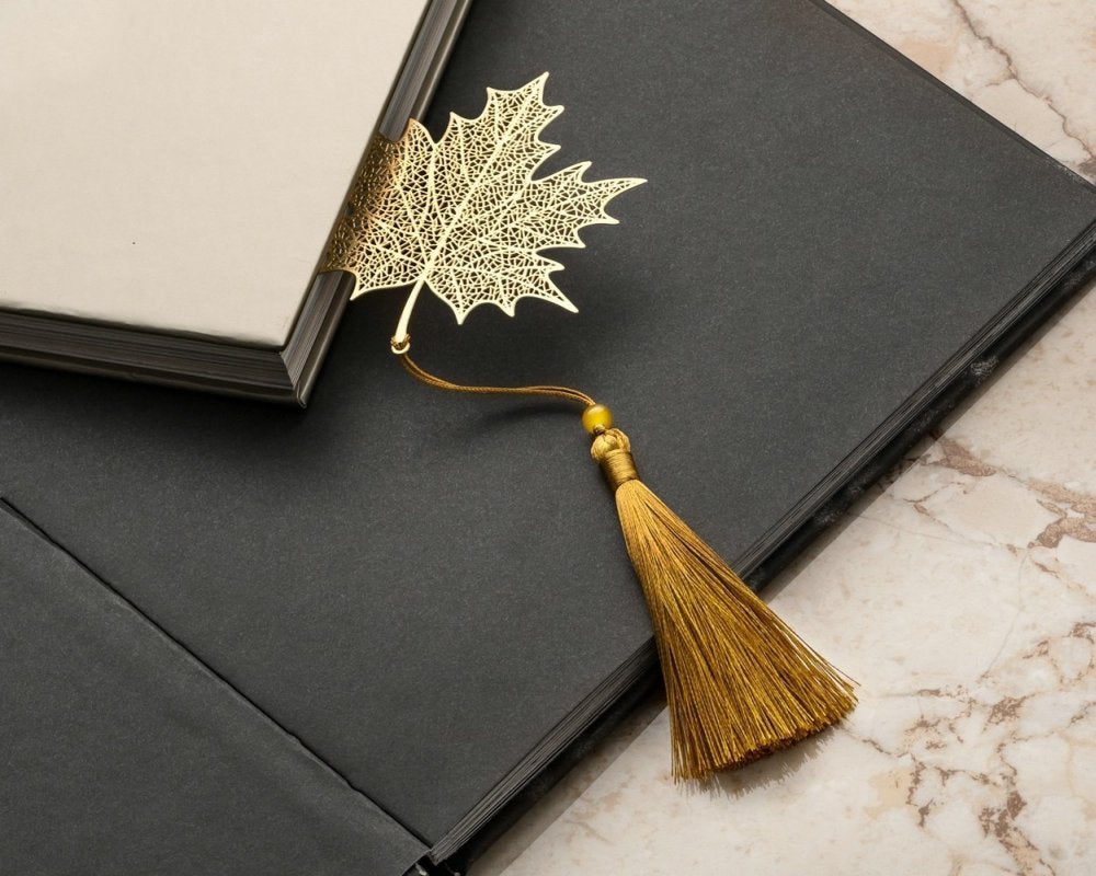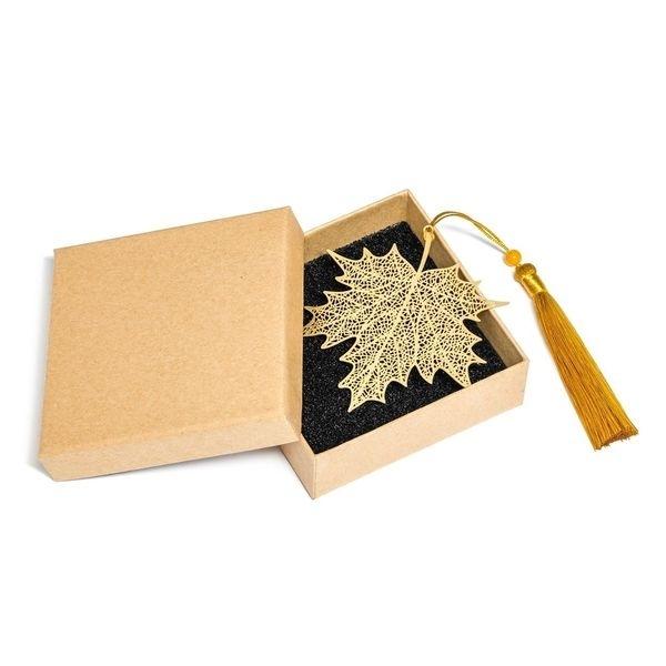 Labai elegantiškas ir stilingas knygos skirtukas, pagamintas aukso spalvos klevo lapo formos, su dekoratyviniu kutu ir karoliuku. Tai ne tik praktiškas skaitymo aksesuaras, bet ir simbolinė dovana ypatingam žmogui.