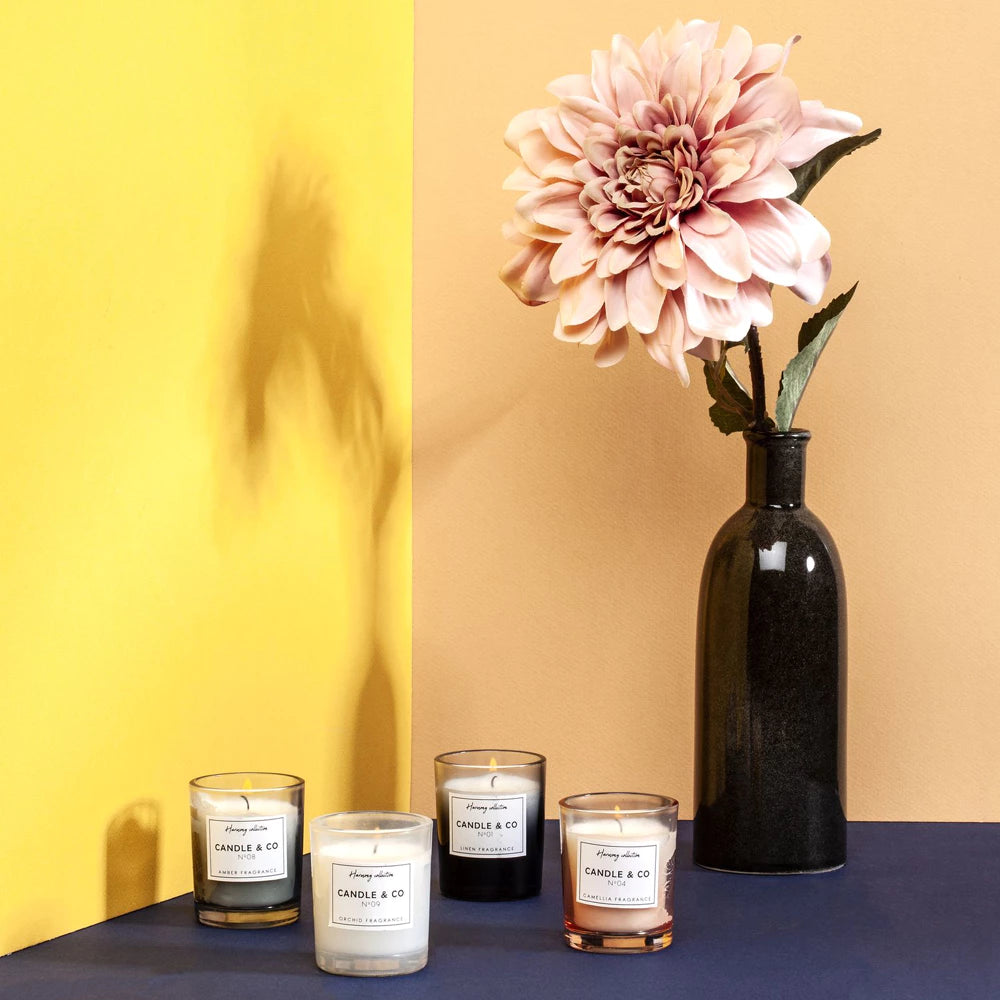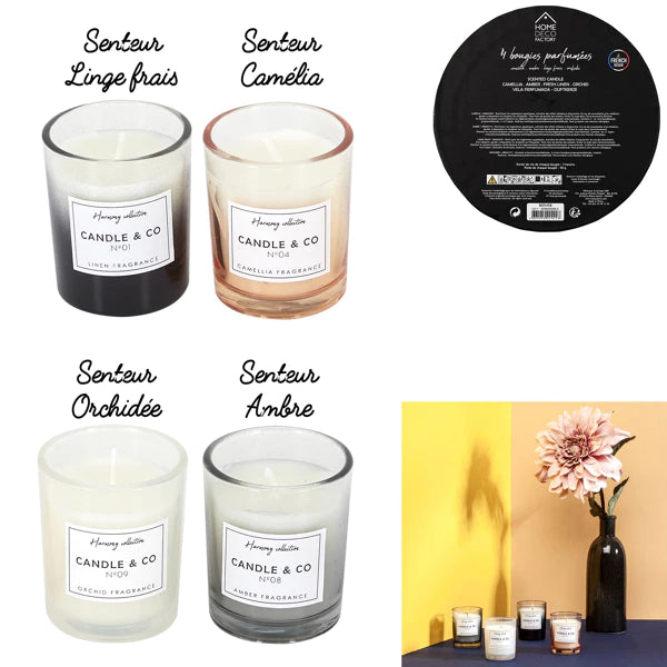Suteikite savo namams jaukumo ir aromatingo žavesio su šiuo elegantišku 4 kvapiųjų žvakių rinkiniu. Kiekviena žvakė supilta į stilingą stiklinį indą ir pasižymi išskirtiniu kvapu – švarių skalbinių, kamelijos, orchidėjos ir ambros.