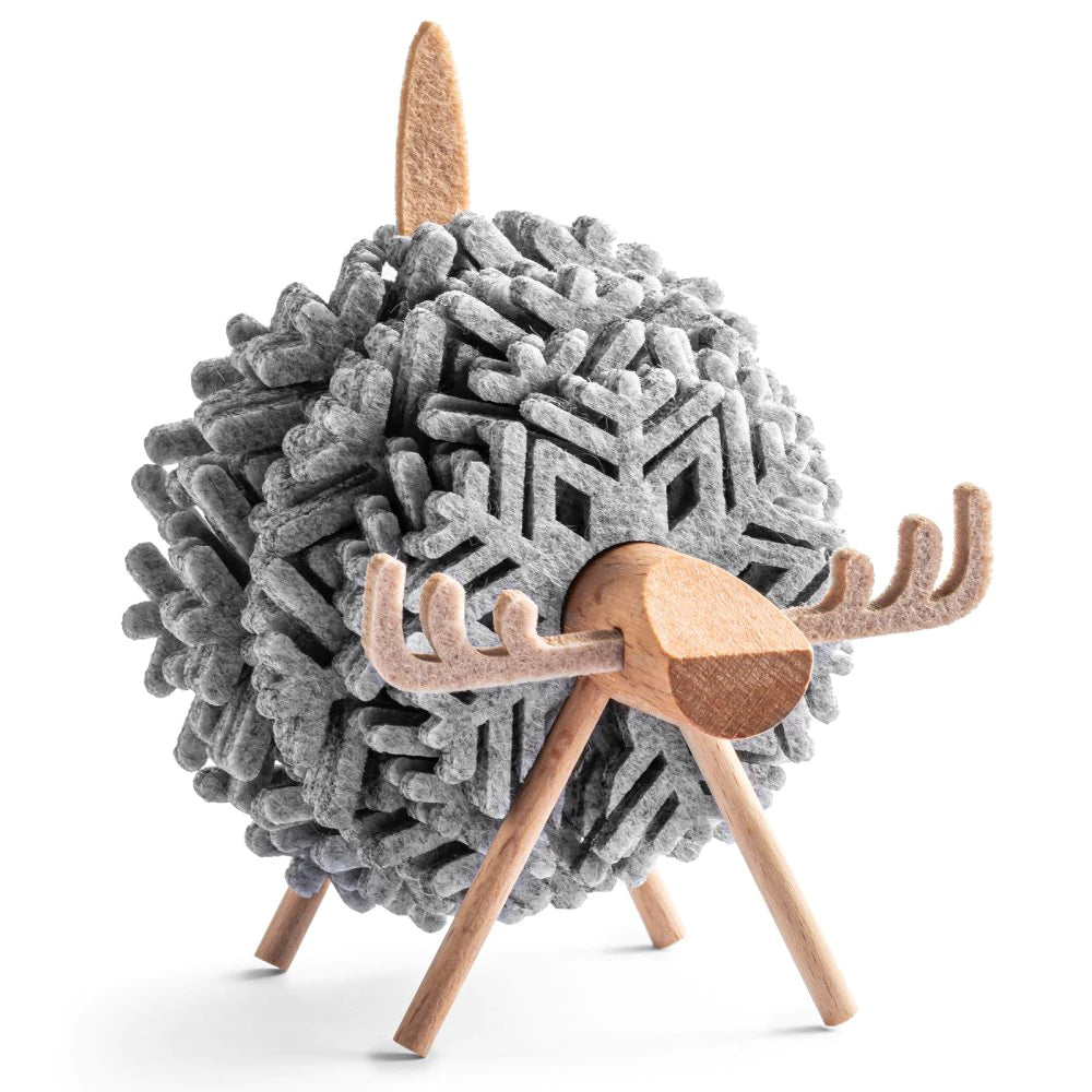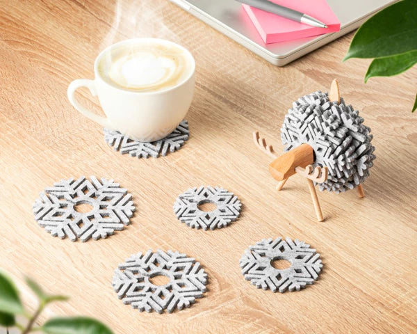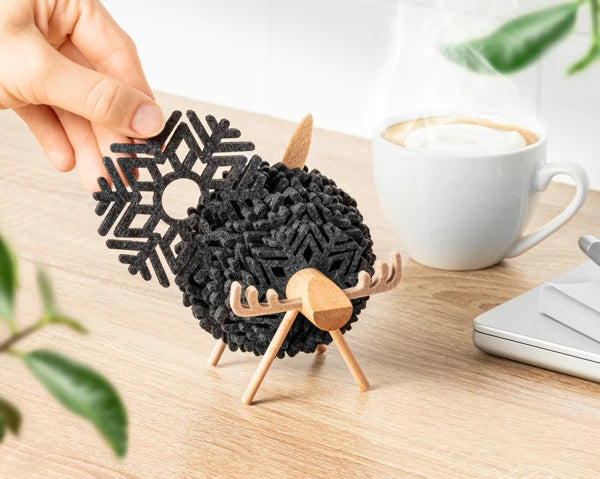 Jei vertinate skandinavišką stilių ir jaukią atmosferą, šis padėkliukų rinkinys taps ne tik praktišku, bet ir dekoratyviu namų akcentu. Net 12 snaigių formos veltinio padėkliukų, sudėti į medinį stovą, kartu su pridėtais ragais bei uodegėle sukuria žaismingą ir dailų briedžio siluetą.