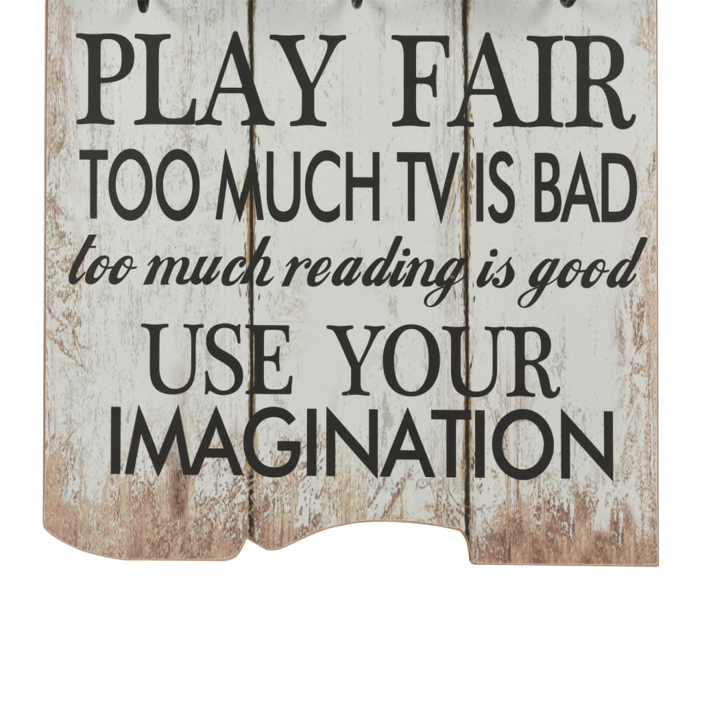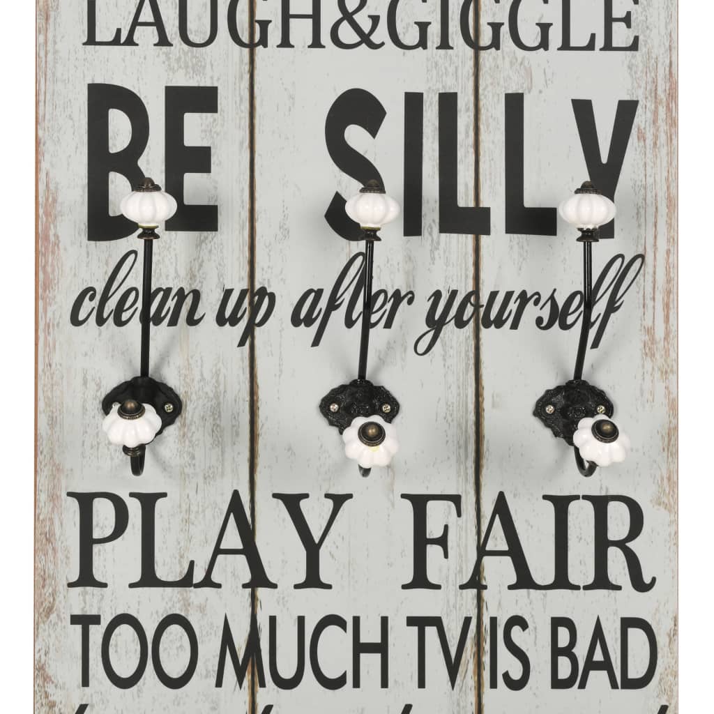 Vintažiniu stiliumi spausdintų žodžių "Play room rules Ignore mean ones Thank you Be silly Play fair Use your imagination" („Žaidimų kambario taisyklės; ignoruokite piktus; ačiū; būkite pakvaišęs; žaiskite gražiai; pasitelkite savo vaizduotę") dėka, ši prie sienos montuojama paltų kabykla su 6 kabliukais, bus tikra puošmena, kurią jūsų svečiai iš karto pastebės.