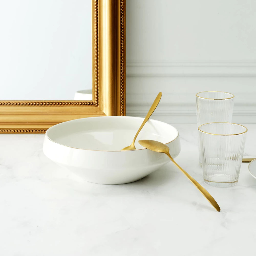 Pridėkite išskirtinumo savo stalo serviravimui su elegantišku porcelianiniu salotų dubeniu „Lisere Doré“. Subtilus auksinis apvadas ir švari balta spalva sukuria prabangos įspūdį, kuris puikiai dera tiek prie šiuolaikinio, tiek prie klasikinio interjero.