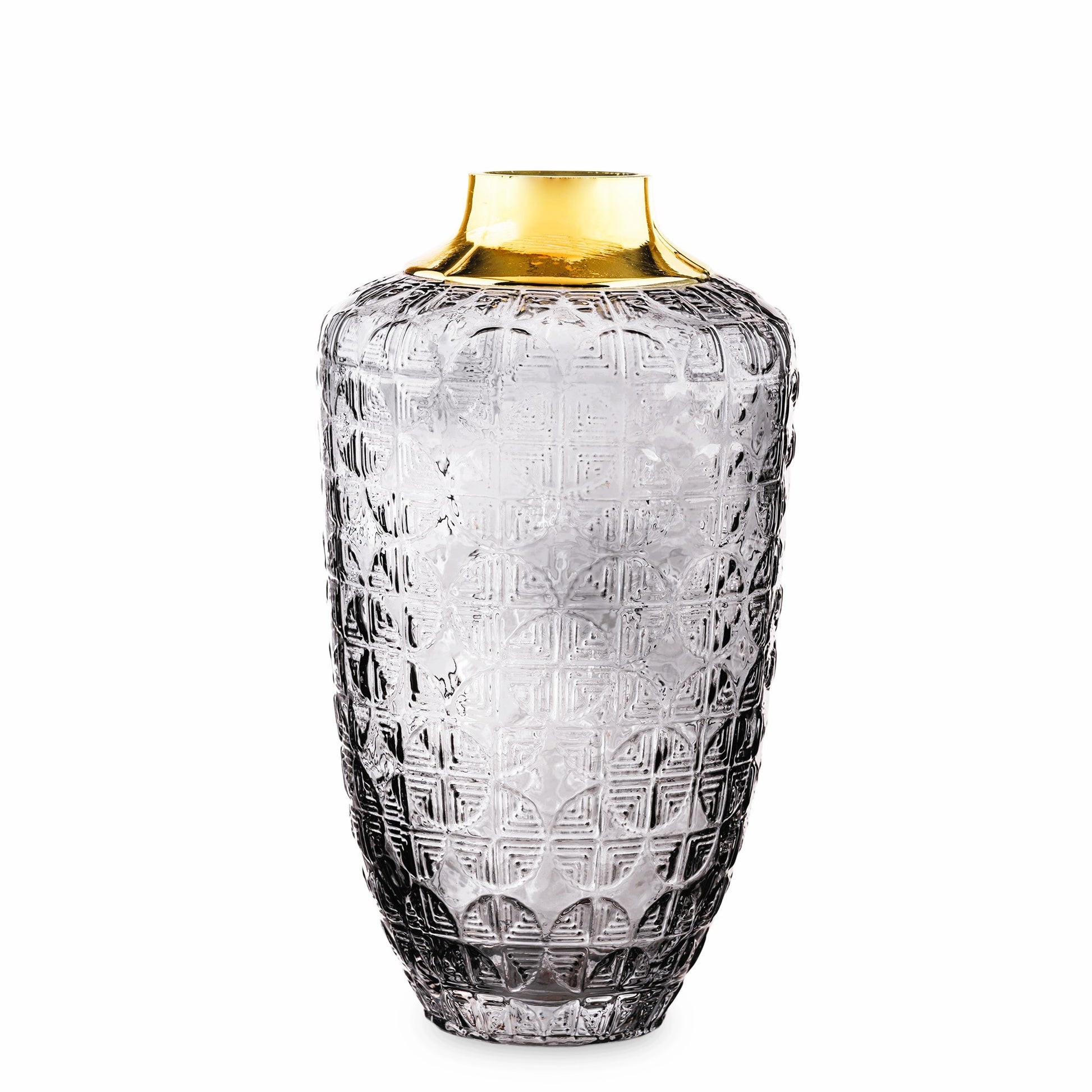 Išskirtinio dizaino skaidri pilko stiklo vaza su elegantišku auksiniu kakleliu – subtilus ir stilingas interjero akcentas. Vazos banguoto paviršiaus tekstūra žaismingai atspindi šviesą, suteikdama jai gylio ir išraiškingumo.
