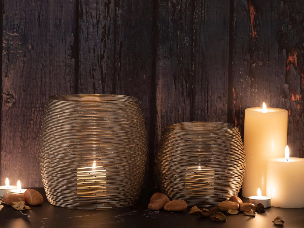 - Rinkinys iš 2 žvakidžių: didelis: Ø 15 cm / aukštis 18 cm, mažas: Ø 13 cm / aukštis 15 cm – tinka LED arba tikro vaško žvakėms.